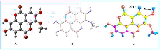 (A) Optimized geometry (B) XRD of 3-O-methylellagic acid dihydrate (2) and (C) superposition of the optimized structure on the experimental structure atom by atom.
