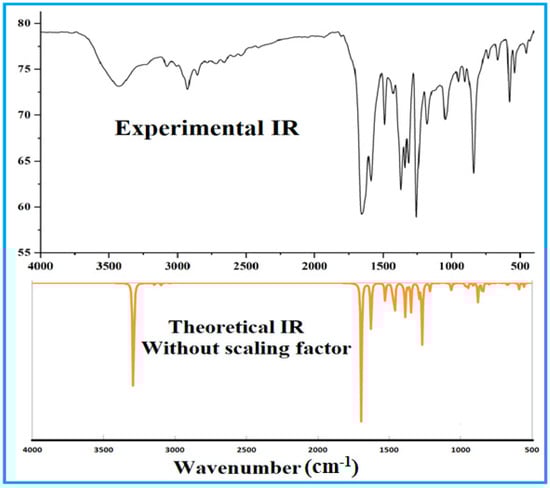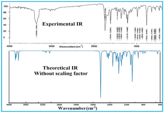 The IR frequencies of the optimized geometry of the isolated compounds 1 and 2 were computed at the same basis set using a double harmonic approximation. Experimental and simulated IR spectra of compounds 1 and 2 are demonstrated in Figure 4 and Figure 5. Table 2 displays the positions of some significant infrared (FTIR) vibrational bands of both compounds as well as their theoretical values (in cm−1), intensities, and assignments. In general, harmonic frequencies overestimate the experimental frequency due to systematic errors triggered by basis set incompleteness error, different approximations, and lack of vibrational anharmonicity used in both compounds in the current DFT calculations. The IR data of both compounds 1 and 2 obtained from theoretical and experimental were compared with the literature [].