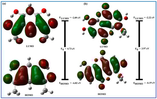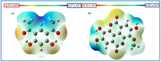 In the study of biological recognition processes and hydrogen bonding interactions, the MEP map is a useful tool for qualitatively interpreting electrophilic and nucleophilic reactions [,,]. Molecular electrostatic potential of 4,6-diacetylresorcinol (1) and 3-O-methylellagic acid dihydrate (2) are calculated using the optimized structures of both compounds applying at B3LYP/6-311G(d,p) basis set, and their plots are shown in Figure 13. Colored figures of compounds 1 and 2 were a significant sign of inter- and intramolecular interactions and reactivity of molecules. The red to blue color of the graphs reflects the electron-rich to electron-poor regions. Carbonyl oxygen and hydroxyl oxygen atoms (O13, O14, for 1 and O2, O6, O8 with ionizable protons) at the bottom of the reddish region have an electron rich area of 1 and 2, potentially the most aggressive nucleophilic attack region. On the other hand, an electron poor region with a bluish color overlying a phenolic proton of the isolated compounds that may demonstrate an electrophilic behavior.
