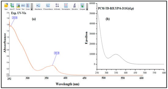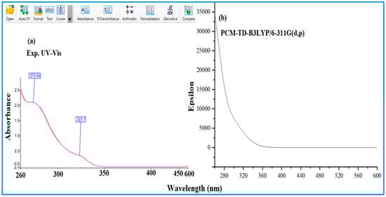 Experimental (a) and calculated (b) UV-vis absorption spectra of the 4,6-Diacetylresorcinol.