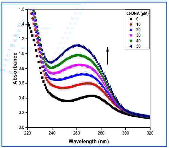 UV–Visible absorption spectroscopy is one of the most fundamental and extensively used experimental techniques for evaluating the stability of ct-DNA and interactions with small ligand molecules []. Complex formation is usually accompanied by changes in the intensity and position of the absorption spectra []. The absorption maximum of compound 2 was centered on 273 nm. The maximum absorption band of compound 2 increased with increasing ct-DNA concentrations, accompanied by a shift of 11 nm, indicating the formation of a complex, as illustrated in Figure 14. Intercalation as a possible method of binding was discarded because it typically involves hypochromic or isosbestic points [].