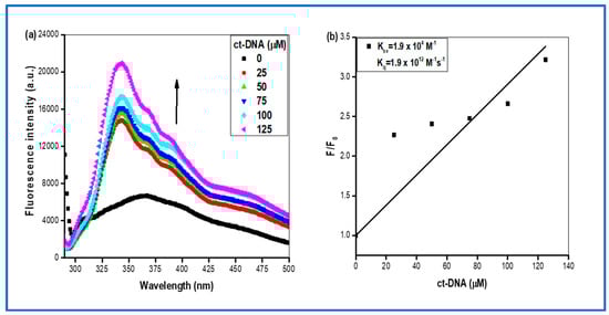 Fluorescence spectroscopy is undoubtedly one of the extensively used techniques for studying the interactions between small ligand molecules and DNA. High sensitivity, large linear concentration range, and selectivity are its advantages over other techniques. It can also be used to determine the pattern of compound binding to ct-DNA, as well as providing a variety of other details about the binding mode, strength, and number of binding sites in ct-DNA []. Compound 2 (200 µM) was excited at 273 nm and showed emission maxima at 367 nm. As demonstrated in Figure 15a, after consecutive additions of ct-DNA (0–125 µM), the intensity of compound 2 emission grew dramatically. This suggests the possibility of a complex-forming between them [].