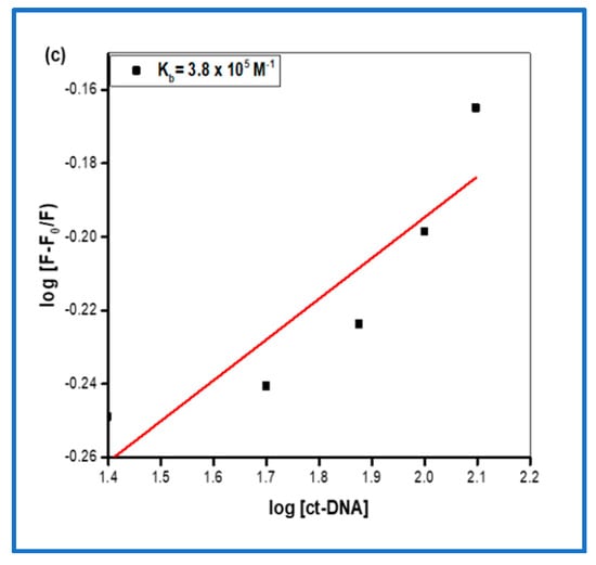 where Kb is the binding constant, and n is the number of binding sites of compound 2 in ct-DNA double helix. As shown in Figure 15c, the log [(F − F0)/F] vs. log [ct-DNA] plot’s slope and intercept were calculated using Equation (3).