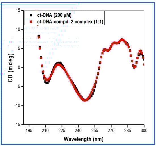 The CD spectra of ct-DNA (200 µM) alone and ct-DNA complexed with compound 2 in the molar ratio 1:1.