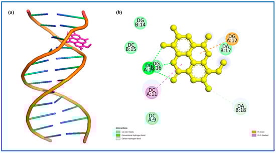 Molecular docking is a scoring function-based technique for predicting the interaction mechanism of a small molecule in a protein’s binding site with the optimal orientation and affinity []. It is also utilized to back up the findings obtained through spectroscopy and fluorescence-based experiments. Compound 2 was docked against B-DNA dodecamer d(CGCGAATTCGCG)2 (PDB ID:1BNA). Docking studies reveal that molecule 2 binds in DNA’s minor grooves with a binding energy of −8.7 kcal mol−1, as illustrated in Figure 17a. Compound 2 engages with DNA via two hydrogen bonds (DG) with bond lengths of 2.34 and 2.31 Å, which help compound 2 binding to DNA to be stable.