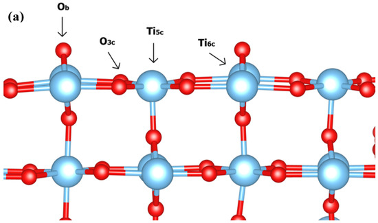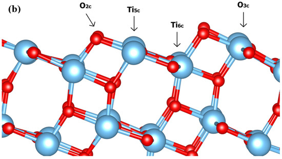 Structure of TiO2 surfaces in the z-direction (a) rutile (110) and (b) anatase (101). Where Ob is a bridging oxygen, O3c a three-coordinated surface oxygen, Ti5c a penta-coordinated surface Ti atom, and Ti6c a hexa-coordinated Ti atom.