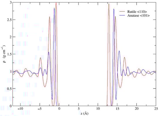 Density profile of adsorbed water molecules (g cm−3) at TiO2 surfaces along the z-direction.