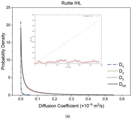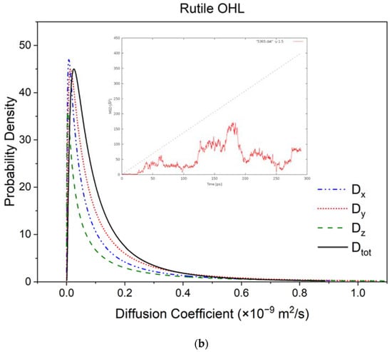 We also suggest that the diffusivity values in the IHL show rather anisotropic characteristics as a result of the preferential motion along the ridges in the structure [41] (cf. Figure 1 and Figure 6), which can somehow be confirmed by the similarity of self-diffusion values between both IHL of the surfaces for longer MSD sub-intervals presented in this study. Looking at anatase (101) IHL specifically, it is seen that diffusivity in the direction perpendicular to the rows of Ob is about 2 times higher than in the direction parallel to them, and 1 time higher than diffusivity away from the surface (cf. Table 2). This suggests a strong preference for the water molecules to move over or between the closely packed rows of Ob in anatase (101) rather than along them, contrary to intuition. However, for rutile (110) IHL, and considering particularly small diffusivity here, molecules would tend to be more mobile along the channel of Ti5c (cf. Figure 3). It is worth noting that these values reflect the diffusivities of individual adsorbed water molecules identified in the IHL and OHL following an occupancy filter of 95% confidence.