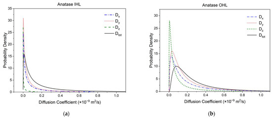 It was observed that the diffusion constants of the interfacial water differ from the bulk region by one order of magnitude, showing markedly lower values. Similar behaviour can be seen in Table S1 for self-diffusivities of anatase (101) in shorter 50 ps sub-intervals. This is an expected behavior since the first adsorbed layer is characterized by a certain confinement due to the interaction with the TiO2 surface, in which case is bonded to surface oxygen O2c/Ob atoms via coordination to unsaturated surface Ti4c/Ti5c atoms and Hw [54,55]. (cf. Figure 1) The comparison of normalized probability distributions for molecular self-diffusivities in the IHL and OHL for both anatase (101) and rutile (110) for the first 50 ps of the 300 ps sub-intervals are shown in Figure S2 (cf. Supplementary information), where some difference in the widths and the positions of the maxima is evident. The plots in Figure S2 are normalized such that the area under the curve represents the total number of water molecules present in the adsorbed layers. At first glance, we can see the high ordering effect in the IHL of both anatase (101) and rutile (110) considering the markedly inferior diffusivity values, whereas in the OHL water molecules are definitely less ordered, allowing a greater mobility. It is valid to say then the water molecules show inhomogeneous diffusive properties within distinct adsorbed layers: firmly adsorbed and sluggish in the IHL—especially in the rutile (110) surface, relatively mobile in OHL, and most mobile in the bulk region, which agrees well with experimental and theoretical results [51,56].