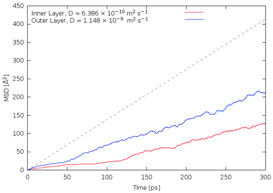 The self-diffusion constant of water along xy plane (parallel to the surfaces) and z-direction (perpendicular thereto) at either surface was obtained from the Einstein relationship as the limiting slope from the mean-square displacement (MSD) [29,32]: