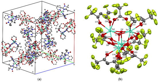 As Figure 1b shows, the anionic portion has a tetranuclear Tb3+ cage cluster in 1. Each Tb3+ ion is coordinated with three OH− ions, and each OH– ion plays the role of a tripodal bridge, forming a cube-like structure. The intra-cuboid Tb–O bond lengths varied from 2.329(3) to 2.429(3) Å, the Tb–O–Tb angles from 105.06(11) to 108.67(11)°, and the O–Tb–O angles from 69.04(10) to 71.47(10)°. Thus, the cubane-like cluster was considerably distorted with the wider Tb–O–Tb angles and narrower O–Tb–O angles, compared to 90°. The peripheral ligands were characterized as follows: each Tb3+ ion was capped with an hfac anion, and every Tb···Tb diagonal was bridged with a tfa anion. Several tfa-bridged lanthanide complexes are known in the literature [30]. Thus, the tetra(µ3-hydroxo)- and hexa(µ-η2(O,O’)-tfa)-bridged structure in 1 can be regarded as an approximate Td symmetry. The Tb3+ ions are eight-coordinate, and the SHAPE analysis [31] indicates that the TbO8 coordination spheres are best described as a triangular dodecahedron (TDD-8). Hydrogen bonds were found between the anion and cation moieties; the O···O distances were 2.991(5) and 2.918(4) Å for O2–H2···O25 and O4–H4···O29, respectively. Such interactions brought about an L-shaped cation–dianion–cation arrangement, and the resultant bulkiness seems to afford a void space in a crystal lattice, where the crystal solvent molecules were incorporated.
