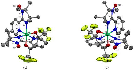 As for the cation moiety of 1 (Figure 1c,d), we can find two 2pyIN chelate rings around the Ni2+ (3d8) ion. The C2py-C2im–N–Ni torsion angle, ϕ, is proposed to be a convenient metric to assess magnetostructural relationship. The torsion angles were 1.1(6), 1.7(6), −2.5(6), and 0.7(5)° around the C40–C33–N1–Ni1, C52–C45–N4–Ni1, C69–C62–N7–Ni2, and C74–C81–N12–Ni2 bonds, respectively. These small torsions guarantee the absence of dz2/dx2–y2–π* orbital overlap. A closely related 2p/3d = 1/1 complex [Ni(hfac)2(2pyIN)] was reported to display orthogonal d–π* orbital arrangement and ferromagnetic coupling [36]. According to the magnetostructural relationship, the critical |ϕC|, where the exchange coupling alters from ferro- to antiferromagnetic, was reported to be 12.8(8)° for the Cu2+ and Ni2+ compounds [7] and 21(1) or 26(3)° for the Ni2+ compounds [37]. We can safely predict that the [Ni(hfac)(2pyIN)2]+ portions in 1 should behave as a ground quintet species.