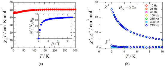 Direct and alternating current (dc and ac, respectively) magnetic susceptibilities of 1 were measured on MPMS-XL7 and MPMS3 SQUID magnetometers (Quantum Design Inc., San Diego, CA, USA). For the dc measurements, the magnetic responses were corrected with diamagnetic blank data of the sample holder measured separately, and further diamagnetic contribution was estimated from Pascal’s constants [29].