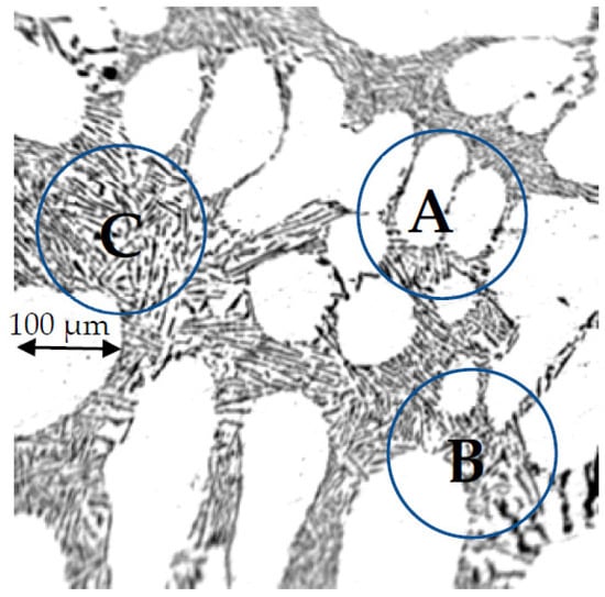 Based on differential thermal analysis (DTA) measurements, the solidification path of binary nonmodified Al–7wt% Si alloy was determined with the equilibrium phase diagram []. Solidification started at a temperature of 614 °C by the formation of α aluminum dendrites (white part in Figure 1) and was completed by the development of Al–Si binary eutectic (Al solid solution and Si) at a temperature of 574 °C (black part in Figure 1). One part of the eutectic was located between the secondary and tertiary dendrite arms (“A” in Figure 1), while the other part was situated between the primary dendrites (“B” in Figure 1) or at the grain boundaries (“C” in Figure 1).