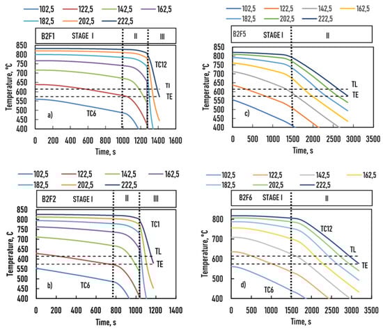 The temperatures measured by the TC1 to TC5 thermocouples were lower than the TE eutectic temperature, so this part of the sample was not melted and remained fully solid during the whole experiment. Thus, only the cooling curves of the samples (T (t) function) recorded by the TC6 to TC12 thermocouples are displayed in Figure 2. The two dashed horizontal lines indicate the liquidus and eutectic temperatures, respectively. The dotted vertical lines show the instances where the solidification conditions were changed from stage I to stage II. On the top of the figures, the positions of the thermocouples (in millimeter) are given.