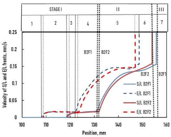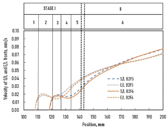 - From 124 to 132 mm: The S/L front velocity decreased from 0.02 to 0.015 mm/s, while the E/L front velocity increased from 0.015 to 0.03 mm/s.