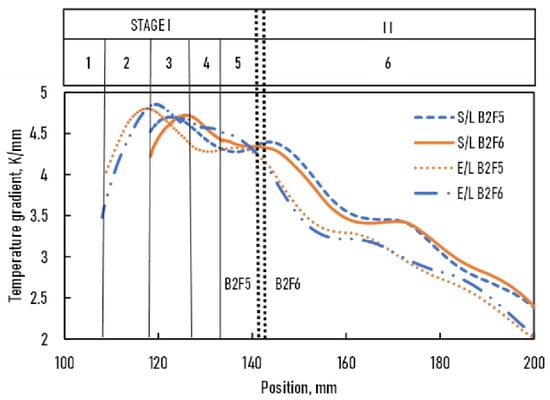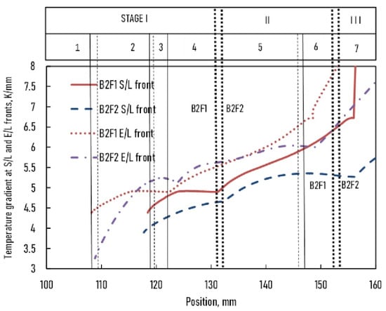 For the B2F1 and B2F2 samples (Figure 5), the GL (xs) and GE (xs) functions evolved in parallel and increased from the bottom to the top of the samples. The temperature gradient at the E/L front was higher than at the S/L front throughout solidification. However, a difference was observed in both samples. At the S/L front, the temperature gradient of the B2F1 sample was higher than that of the B2F2 sample by about ~0.5 K/mm. In contrast, the temperature gradient at the E/L front was comparable in both samples in parts 4 and 5, where the velocities of the S/L and E/L fronts were the same.