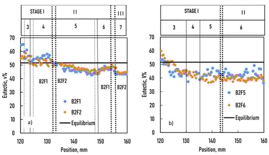 The measured amount of eutectic vs. position in the sample (a): samples B2F1 and BF2, (b): samples B2F5 and B2F6.
