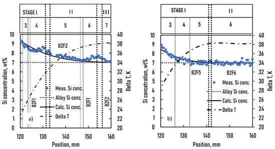 The calculation time was 28,000 s for the B2F1 and B2F2 samples and 14,000 s for the B2F5 and B2F6 samples. The stabilization period applied during the microgravity experiments. The results of the calculations are depicted in Figure 8. The concentration distribution can also change during solidification. It is similar to what happens in the initial mushy zone; Si diffuses to the liquid phase at the level of the S/L front from the moving mushy zone. As a result, the liquid phase concentration at the level of the S/L front increases, while the average concentration of the solidified part decreases behind the front. Because the front velocity was slower in stage I than in stage II in B2F1 and B2F2 samples and constant during the whole experiment in both B2F5 and B2F6 samples, diffusion could be significant during all experiments. This phenomenon is well known as gradient undercooling (ΔTG = DL∗G/v) []. In the case of B2F5 and B2F6 samples, the initial concentration slightly decreased in stage I, and because the overall concentration of the sample was constant (7 wt%), it increased in stage II. In the case of B2F1 and B2F2, in part 3 and at the beginning of part 4, the concentration decreased slightly, similar to the case of B2F5 and B2F6 samples. In part 4, the S/L front moved with 0.02 mm/s, but the E/L front moved with a continuously increasing velocity, hindering the diffusion of Si from the mushy zone to the liquid phase. The Si that remained in it increased the average Si concentration of this part. A similar phenomenon was visible in part 6.