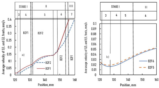 Average velocity of S/L and E/L fronts vs. position in the sample (a): samples B2F1 and BF2, (b): samples B2F5 and B2F6.