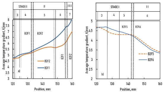 Average temperature gradient of S/L and E/L fronts vs. position in the sample (a): samples B2F1 and BF2, (b): samples B2F5 and B2F6.