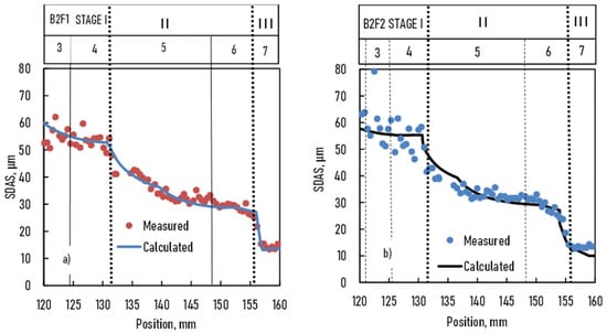 For B2F1 and B2F2 samples, the solidification parameters and the initial concentration distribution before solidification were practically the same. Consequently, the measured DAS was very similar for both samples, and the ratio of the average DAS of the two samples was 1.05. The agreement between the measured DAS and the calculated SDAS was good despite the fact that DAS generally overestimates the SDAS as discussed above. The used correction factor K was 7.5. The scattering of the measured DAS when the cooling rate was slow (parts 3 and 4) was wide and higher than in parts 5, 6, and 7, where the cooling rate increased. For the B2F2 sample, stirring by magnetic induction in stage II did not affect the SDAS.