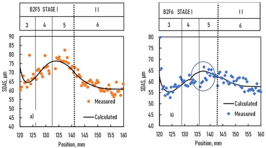 For B2F5 and B2F6 samples, the solidification parameters and the concentration distribution before solidification were practically the same, similar to the case of B2F1 and B2F2. The measured DAS was similar but not identical for both samples. In the calculations, the correction factor K was 10 and 9 for B2F5 and B2F6 samples, respectively. The agreement between the measured and calculated SDAS was not so good compared to the case of B2F1 and B2F2 samples. The scattering of the measured DAS was higher than in B2F1 and B2F2 because the microstructure was coarser (like the microstructure of parts 3 and 4 of B2F1 and B2F2 samples). When magnetic induction was switched on in B2F6, the S/L and the E/L fronts were at 132 and 142 mm, respectively. The decrease in DAS between parts 4 and 5 (marked by a circle in the figure) would have resulted from the melt flow induced by magnetic induction. Because of the very low front velocities, the time was long enough to develop the magnetic stirring effect. In the B2F2 sample, the front velocities were higher, so a similar effect was not seen.