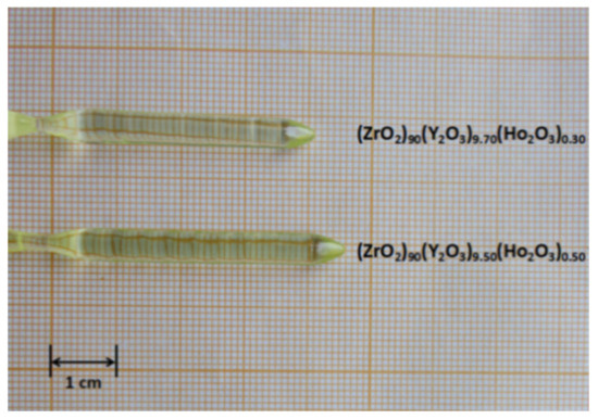 (ZrO2)90(Y2O3)9.70(Ho2O3)0.30 and (ZrO2)90(Y2O3)9.50(Ho2O3)0.50 crystal rods.