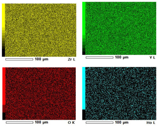 Analytical measurements were made on a (ZrO2)90(Y2O3)9.25(Ho2O3)0.75 crystal disc using energy-dispersive X-ray (EDX) spectroscopy on our SEM instrument. The SEM–EDS measurements showed that all Zr, Y, Ho, and O elements were evenly distributed, and thus the doping elements were well dispersed in the crystal, as shown in Figure 2.
