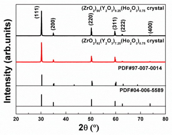 ZrO2 could exist in three crystal structures: monoclinic, tetragonal, and cubic. At ambient temperature, the monoclinic phase was the stable form, and it transforms into the tetragonal phase at 1170–2370 °C and the cubic phase at temperatures above 2370 °C to its melting point at 2716 °C [17,18]. There was a transition from the tetragonal phase to the monoclinic phase during the preparation of zirconia from high temperature to room temperature. This transition caused a volume expansion of 4.5%, which caused the crystal to crack [18]. The addition of certain kinds of oxides such as Y2O3, TiO2, CaO, and CeO2 to pure ZrO2 stabilized a cubic or tetragonal phase down to room temperatures [19,20]. Y2O3 was the most common oxide additive. Both Y(III) and Zr (IV) have closed-shell electronic configurations and no transitions that could interfere with those of Ho3+. The tetragonal or cubic phase could be stabilized by adding Y2O3 [21]. High-quality crystals could be grown using the optical floating zone method [22].