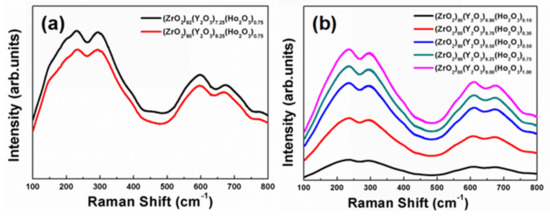 Because of the high degree of similarity in the XRD patterns from the tetragonal and cubic structures, additional measurements were needed to conclusively identify the phase composition of the Ho3+ doped YSZ samples. This could be achieved by Raman spectroscopy because the tetragonal phase produced six peaks (A1g + 2B1g + 3Eg), while the cubic phase had only one active mode (F2g) [23]. The Raman spectra of all crystal samples were shown in Figure 4a,b; all contained peaks at about 237, 295, 406, 609, and 680 cm−1, and, thus, they were consistent with the tetragonal structure [24]. Therefore, the Ho3+ doped YSZ single crystal was a tetragonal structure.