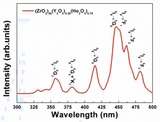 The absorption spectrum of the (ZrO2)90(Y2O3)9.25(Ho2O3)0.75 crystal contained eight peaks, at 245, 359, 382, 416, 446, 484, 537, and 635 nm. The absorption peak at 245 nm was considered as the charge transfer transition from the valence to the conduction band in the zirconia matrix [38,39,40,41]. However, the other 7 peaks were the results of the transitions from the 5I8 ground state to the 5G2, 5G4 + 3K7, 5G5, 3K8 + 5F1 + 5G6, 5F3, 5F4 + 5S2, and 5F5 excited states of the Ho3+ ions [42,43]. An absorption band was found at 446 nm corresponding to the transition from 5I8 to 3K8 + 5G6 + 5F1 due to hypersensitivity, which obeyed the selection rules , , and . This represented the sensitivity around Ho3+ in the matrix [44]. The absorption intensity was influenced by the concentrations of Ho3+. Figure S2 (see Supplementary Materials) indicated that the absorption intensity was influenced by the concentrations of Ho3+.