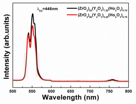 The PL spectra for (ZrO2)92(Y2O3)7.25(Ho2O3)0.75 and (ZrO2)90(Y2O3)9.25(Ho2O3)0.75 crystals under the excitation at 446 nm were shown in Figure 6. Their spectral shape did not change with Y2O3 concentration. As we know, the symmetry of the main material was an important factor affecting the luminescence intensity [32,33]. XRD and Raman spectra indicated that both crystal samples were tetragonal structures. In addition, the concentration of defects also affected the luminescence intensity of RE3+ [34].