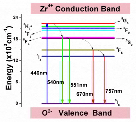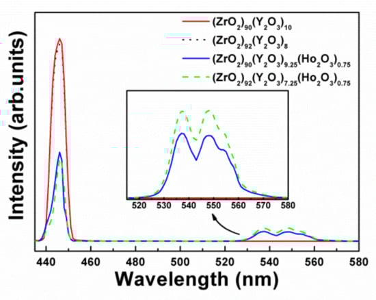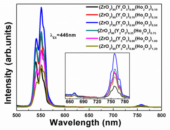 The PL spectra of the (ZrO2)90(Y2O3)10−x(Ho2O3)x crystals under the excitation at 446 nm were shown in Figure 10.