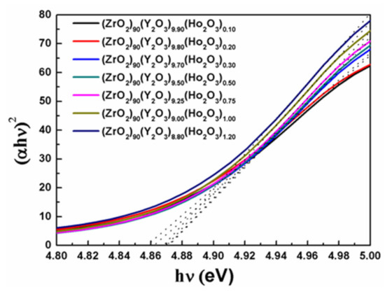 where α was the absorption coefficient of the crystal sample, B was the constant, and hν was the energy of the absorbed photon. A plot of hν against (αhν)2 was shown in Figure 9 and the point of intersection of the linear region with the X-axis gave an assessment of Eg. Values for the slopes, interceptions, regressions, and the optical band gaps Eg were presented in Table 4, which showed that the Eg of the (ZrO2)90(Y2O3)10−x(Ho2O3)x crystals were about 4.86 eV, and the crystals were wide bandgap materials. The optical band gaps of the Ho2O3:YSZ crystals were different from those in Dy2O3:YSZ crystals, where the optical band gap energy of the Dy2O3:YSZ crystals increased with Dy2O3 contents [46].
