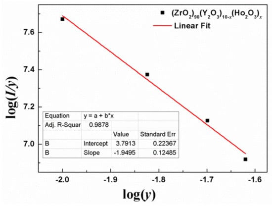Relationship between log(I/y) vs. log(y) in (ZrO2)90(Y2O3)10−x(Ho2O3)x crystals.