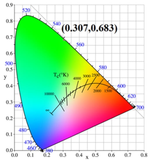 The measurement of color coordinates of a light source was an important method for characterizing its quality. In general, the overall emitted color was represented by the CIE chromaticity coordinate (x, y) [50,51].