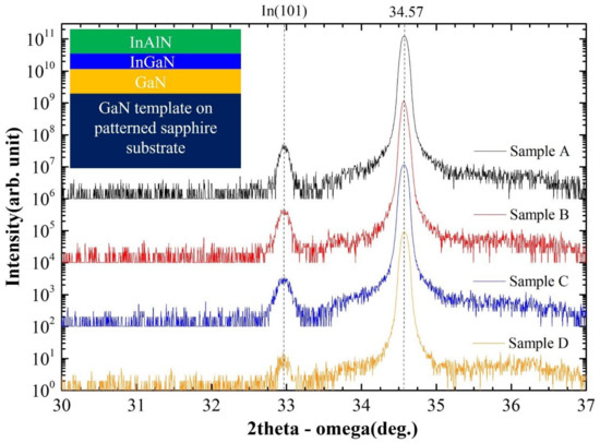 (Color online) X-ray 2θ-ω scans of samples A–D. The peaks at 2θ = 33.96°, 34.57° corresponded to In (101) and c-plane GaN, respectively. The inset shows the schematic of a single GaN/InGaN/InAlN quantum well.