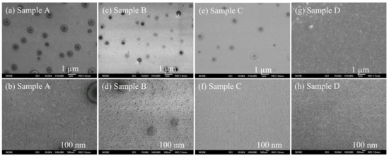 (a,b) Secondary electron microscopy (SEM) images of sample A, (c,d) sample B, (e,f) sample C, and (g,h) sample D with scale bars of 1 µm and 100 nm, respectively.
