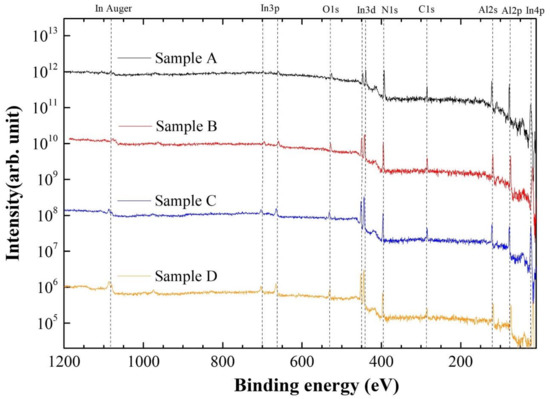 (Color online) XPS survey spectra of samples A–D. The spectral windows of Al2p, In3d, N1s, O1s, and C1s were considered for the quantification procedure.