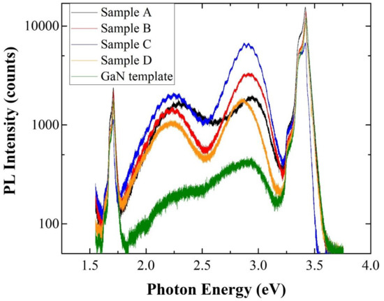 To check the band gap energy, we performed photoluminescence (PL) measurements on all the samples at room temperature, and the results are presented in Figure 5. The GaN template was also used as a background signal, and it was plotted by a green line in Figure 5. By nonlinear curve fitting of the packet near 3.4 eV to Gaussian functions for all the samples, we obtained three peaks. The peaks near 3.43 eV were the contribution from the GaN template for all the samples. The shoulders near 3.37 and 3.27 eV were attributed to the basal stacking faults [21] and the transition of donor–acceptor pairs [22] in the GaN template, respectively. The GaN/InxGa1−xN/InyAl1−yN QW was associated with the peaks of 2.92, 2.90, 2.89, and 2.85 eV for samples A, B, C, and D, respectively. The intensities changed with different thermal treatments. As listed in Table 3, the intensities of QW emission increased from 1908 to 3351 counts in samples A and B, indicating that the optical property was enhanced when the annealing was diminished. It was found that the suppression of indium decomposition increased the epi-layer quality at the InGaN/InAlN interface; resulting in the efficiency of recombination. Moreover, sample C exhibited the strongest QW intensity of 6688, because of the acceleration of cooling rate as well as the cancelation of annealing. On the other hand, the intensity of sample D was 1856, resulting from the difference in thermal expansion coefficient of InAlN and GaN at a high cooling rate [23]. Moreover, the full width at half maximum (FWHM) of InGaN QWs for sample A–D showed a consistent result with the PL intensities. Sample A had the poorest FWHM of (0.68 ± 0.007) eV because of indium decomposition during the annealing procedure. In sample B, the FWHM improved to (0.31 ± 0.005) eV by canceling annealing, and we obtained the best FWHM of (0.26 ± 0.002) eV in sample C because the indium decomposition was further suppressed by the increase in cooling rate. The decrease in FWHM to (0.31 ± 0.005) eV in sample D was caused by the difference in the thermal expansion coefficient of InAlN and GaN at a relatively high cooling rate. These FWHM analyses are consistent with the intensities and XRD findings. To calculate the indium composition in the InGaN QWs, we used the bowing parameter of InGaN to approach the accurate values; the formula for bulk InxGa1−xN is given by Eg(x) = [3.43 − 2.79 × (x) − 1.9 × (1 − x) × (x)] eV [24]. We estimated the content of indium in InxGa1−xN at 11.4%, 11.9%, 12.1%, and 13.1% for samples A, B, C, and D, respectively. The peaks near 2.25 eV contributed to the bandgap transitions or structural defect levels emitted from InxGa1−xN/GaN layers or GaN template [25]. The peaks near 1.7 eV for all samples were associated with the second harmonic signal of GaN template (3.4 eV).
