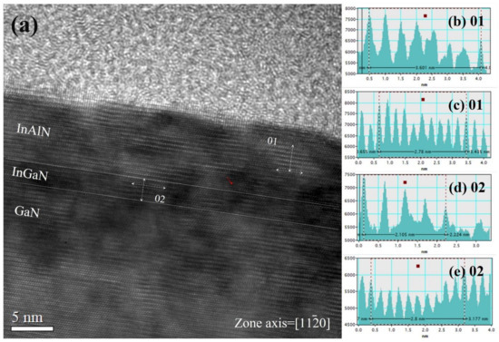 (a) HR-TEM image of sample D with a scale bar of 5 nm; the white line separates the GaN/InGaN/InAlN layers. (b) Atomic layer measurement at InAlN position 01 along the [0002] and (c) [100] directions. (d) Atomic layer measurement at InGaN position 02 along the [0002] and (e) [100] directions.