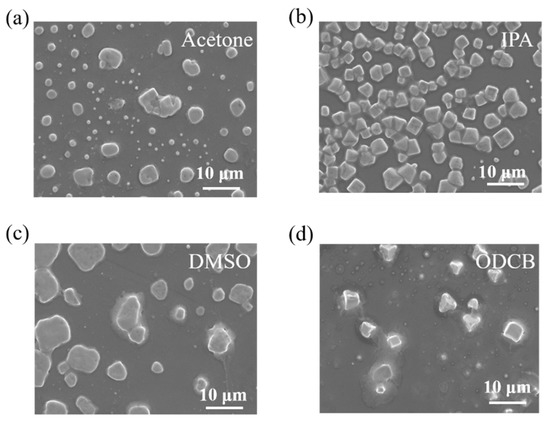 To evaluate the effect of adding a second solvent on the crystalline growth of perovskite, we first evaluated the crystalline growth of 3D perovskite fabricated by a DMF-based co-solvent system using SEM images, as shown in Figure 1. Since the reactants MABr and PbBr2 used for fabricating 3D perovskite need to be dissolved in a non-polar solvent, the use of a solvent of higher polarity, such as formamide, could cause the non-dissolution of the precursors, and the mixed solution showed suspended particles which were slightly yellow in color. DMF was used as the primary solvent because of its good solubility and for having many perovskite precursors. There were many different options for the second solvent, such as acetone, isopropyl alcohol (IPA), o-dichlorobenzene (ODCB), and dimethyl sulfoxide (DMSO). We simply mixed MABr and PbBr2 at a 2:1 molar ratio in a co-solvent system with a 1:1 volume ratio by adding four different solvents (acetone, IPA, DMSO, and ODCB) into the DMF solution. For the case of using acetone and IPA as the second solvent, since both solvents have similar dielectric constants, the surface morphology should be similar; however, the sample using acetone as the second solvent showed more crystalline growth, as shown in Figure 1a. This may be attributed to the higher evaporation rate of acetone due to its lower boiling point temperature. For the case of using DMSO and ODCB as the second solvents, since both solvents have similar boiling points, the surface morphology should be similar; however, less crystalline growth was observed in the case of using ODCB as the second solvent, as shown in Figure 1d.