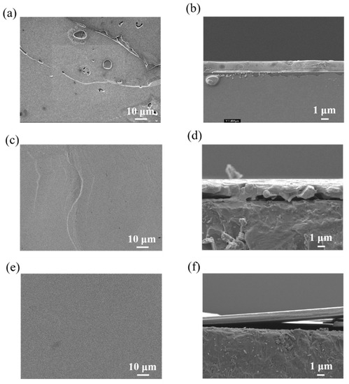 For the fabrication of 2D perovskite, we first tried to use a single solvent, DMF, to fabricate a 2D perovskite film 1.23 × 1.23 cm2 in size using the dip-coating method, in which BABr and PbBr2 were used as precursors. Figure 2 shows surface and cross-sectional SEM images and the XRD pattern of the fabricated films. The surface morphology of the 2D perovskite film obtained by simply dissolving precursors in DMF (single solvent) not only had narrow and long gaps, but also had some defect holes, as shown in Figure 2a, which are not favorable for the light energy conversion efficiency for photovoltaic applications [26]. DMSO, which has a dielectric constant close to that of DMF, was then used as the second solvent in the DMF-based co-solvent system. DMSO and DMF were mixed homogeneously and yielded a transparent mixing solution. However, the boiling point of DMSO is comparably high, which means that it took at least four hours to fabricate the perovskite film at a controlled temperature of 45 °C. Moreover, the film surface showed uneven crystal grains that could be observed with the naked eye. Figure 2c shows the surface morphology of the 2D perovskite film fabricated by the acetone/DMF co-solvent system, showing a better surface morphology. However, the cross-sectional image indicates inhomogeneous crystalline growth, as shown in Figure 2d. The best candidate was using ODCB, which has a similar boiling point to DMSO, as the second solvent. It took 2.5 h to fabricate a thin perovskite film using ODCB, less than when using DMSO. It is speculated that the differences in the dielectric constant of the solvent itself cause different drying times. Figure 2e,f show surface and cross-sectional images of the 2D perovskite film fabricated by the ODCB/DMF co-solvent system. Not only does the surface morphology indicate a homogeneous 2D crystalline structure 2 μm in thickness, but so do the cross-sectional images.