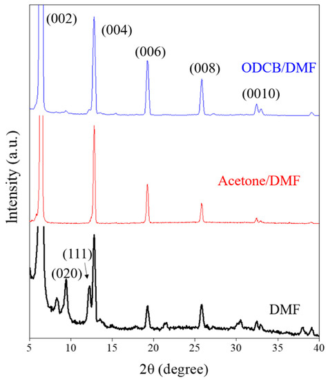 For the XRD analysis, the peaks at 6.4°, 13.2°, 19.4°, 26.3°, and 33.7° correspond to the (002), (004), (006), (008), and (0010) crystal planes, respectively, indicating the existence of a 2D perovskite structure [27,28]. However, other plane directions, such as (020) and (111), also appeared in the 2D perovskite film fabricated by a single solvent (DMF), as represented by the black peaks in Figure 3. Other peaks located at 8.3°, 21.4°, and 30.5° might belong to other planes, such as (111), (020), or (202), due to the complete transformation of a metal organic framework (MOF) structure under evaporation and crystalline processes following long-term annealing treatment [29,30]. However, these peaks were not observed in the co-solvent system, acetone/DMF and ODCB/DMF, as represented by the red and blue peaks in Figure 3. Those characteristic XRD peaks, proving that the crystalline structure of the fabricated 2D perovskite was (C4H9NH3)2PbBr4 [31]. It is obvious that the peak intensities of those 2D planes were comparably higher in the co-solvent fabricated perovskite, and especially that the long-range ordering was increased in the 2D perovskite film fabricated by the ODCB/DMF co-solvent system.