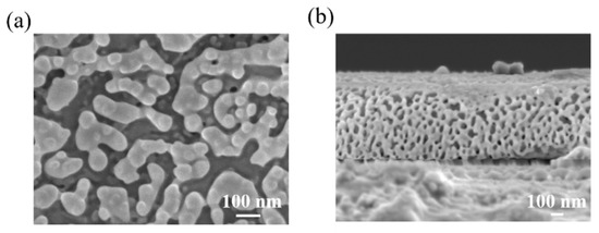 Compared to the single solvent system, the use of a co-solvent or an anti-solvent (acetone or ODCB) yielded a porous surface with grains smaller than 100 nm, as shown in Figure 4a (surface) and Figure 4b (cross-sectional). The porous structure may be ascribed to the change in the slow crystallization process due to the addition of an anti-solvent with a higher boiling point.