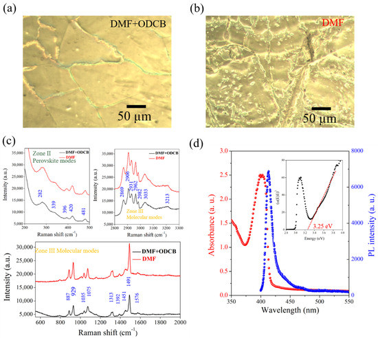 Surface morphology of (C4H9NH3)2PbBr4 2D perovskite observed by OM images using (a) an ODCB/DMF co-solvent or (b) a DMF single-solvent system. (c) Raman and (d) absorption spectra (red) and PL emission (blue) of (C4H9NH3)2PbBr4 2D perovskite film fabricated by single- and co-solvent processes. The inset shows the Tauc plot from the absorption spectra of (C4H9NH3)2PbBr4 2D perovskite with a band gap of 3.25 eV from extrapolation to the energy axis.