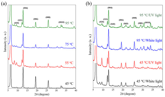 XRD of (C4H9NH3)2PbBr4 2D perovskite fabricated by a dip-coating method under (a) different heating temperatures and (b) different light exposure conditions.