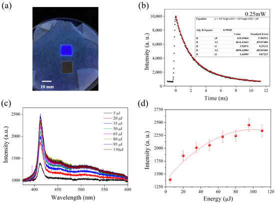 The direct observation of PL emissions from 2D perovskite films was achieved by taking photographs of the glass substrate without and with the growing film on top, as shown in Figure 7a. Homogeneous PL emissions with a large area substrate (1.23 × 1.23 cm2) of the fabricated 2D perovskite film could possibly offer a way to approach scalable, true blue, organic LEDs. The PL lifetime of fabricated (C4H9NH3)2PbBr4 2D perovskite was measured using the TCSPC method, for which a 375 nm picosecond laser wavelength was used for excitation, as shown in Figure 7b. The decay curve showed a bi-exponential feature with lifetimes of 1.45 and 3.93 ns. The PL properties of the 2D perovskite film was further studied by performing an additional excitation power-dependent PL measurement at room temperature, as shown in Figure 7c. An additional PL peak located at 460 nm and a PL shoulder of a longer wavelength appeared when the 2D perovskite film was under higher-energy laser irradiation. No obvious shift in the PL peak indicates a 2D perovskite film of a larger grain size [38]. The evolution of PL intensity dependent on pumping laser energy is shown in Figure 7d. The saturated PL intensity may be attributed to hot carrier recombination with excited donors and acceptors at higher energy levels [38].
