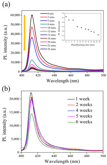 In order to study the photostability of 2D perovskite, the real-time monitoring of the PL intensity and lifetime was carried out over a 30 min time frame, as shown in Figure 8a. The expected degradation of the PL intensity was observed due to the generation of defects under light irradiation [39]; however, the PL lifetime was only slightly decreased from 4.5 to 2.5 ns. Figure 8b shows the spectra of PL intensity recorded in a weekly time frame, in which the photostability of 2D perovskite remained stable in the first five weeks and suddenly decreased in the sixth week.